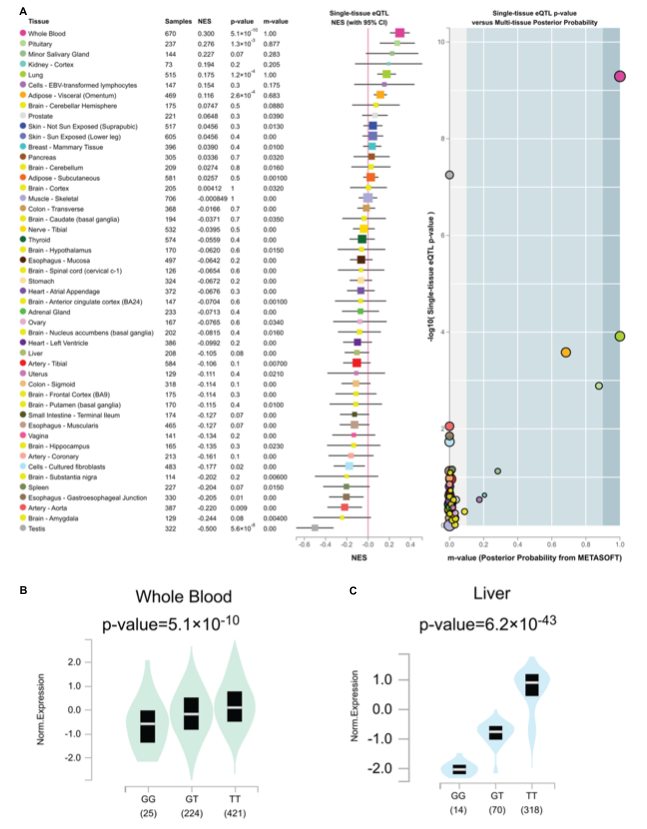 进一步的 eQTL 分析发现,不同基因型在人类全血和肝脏中存在显著的特异性表达。