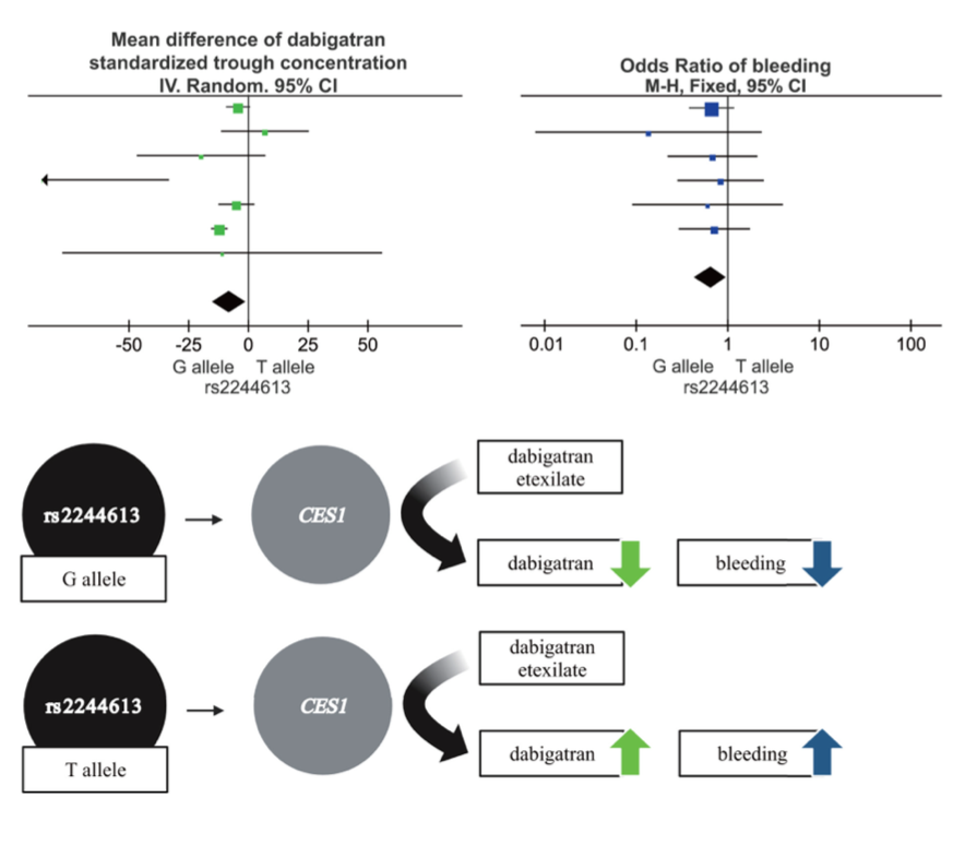 CES1 rs2244613 G 等位基因携带者(与 T 等位基因携带者相比)表现出显著更低的达比加群谷浓度(MD: −8.00 ng/mL; 95% CI: −15.08 to −0.92; p = 0.03),和显著更低的出血风险(OR: 0.65; 95% CI: 0.44–0.96; p = 0.03)。