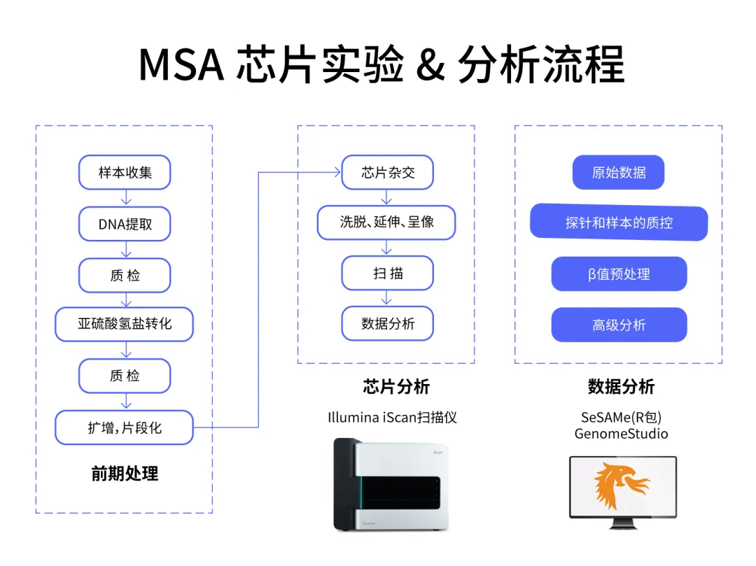 Infinium™ Methylation Screening Array(MSA)是因美纳今年新推出的一款重点覆盖与常见人类特征、疾病表型、环境暴露、衰老等内容相关的 27 万个独特甲基化位点,使用 Infinium™ EX新芯片制式的甲基化基因芯片产品,专注于流行病学研究和面向消费者市场。