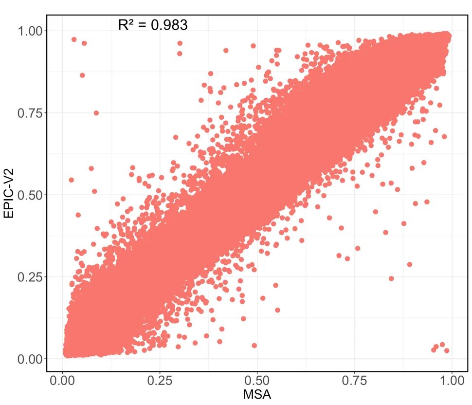 总体来说,MSA芯片在更短的实验周期、更低的DNA起始量和更高的样本通量条件下,实现了高度一致的样本间可重复性,并对不同样本类型和DNA起始量表现出良好的兼容性。与因美纳EPICv2甲基化芯片重合位点的检测结果显示出稳健的一致性。作为因美纳在Infinium™ EX新芯片制式上推出的首款商业化产品,MSA将为研究人类常见性状、常见疾病表型、环境暴露、衰老和细胞类型等领域提供更简便、更实惠且更易获取的解决方案。