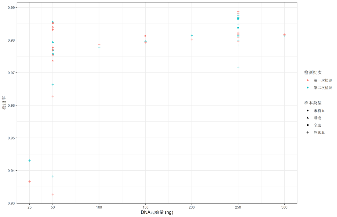 本次测试选用了中华家系1号标准品样本1从25ng至300ng不同的DNA起始量和13组不同组织来源的微基因实验人员样本进行了DNA起始量与样本类型兼容性测试。结果显示,当DNA起始量达到或超过50ng的时候,MSA芯片达到了平均超过96%的甲基化位点检出率。DNA起始量越低,检出率受到样本类型的影响相对越大,但在低至25ng DNA起始量的情况下,仍旧有超过90%的位点成功被检测到。无论是静脉血样本还是末梢血样本的检出率均高于唾液样本,当唾液样本的DNA起始量达到100ng及以上时,MSA芯片也能达到超过96%的位点检出率。