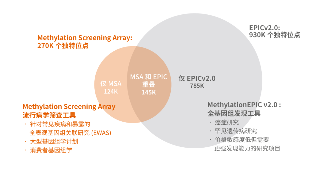 甲基化基因芯片MSA与EPICv2共有145K位点重叠的区域,覆盖了常见疾病关联、衰老时钟、环境暴露和甲基化风险评估等相关位点。