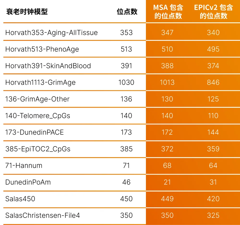 甲基化MSA芯片和EPICv2芯片表观遗传学年龄相关位点覆盖情况(注:Horvath391-SkinAndBlood即下文所用的HorvathS2018模型)