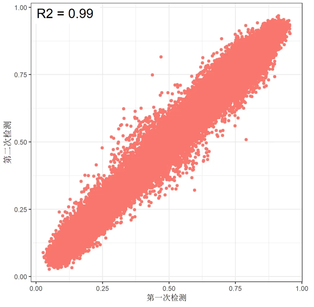 本次测试选用了来自中华家系1号标准品1和来自中山大学华南区域自然人群慢性病前瞻性队列2的共计16组样本在2张芯片间测试相同样本的可重现性,结果显示无论样本来源是全血或者gDNA,同一样本在技术重复之间的甲基化Beta值都高度一致,分析所得的R2达到了98%以上,MSA芯片在技术重复之间展现了良好的可重复性。