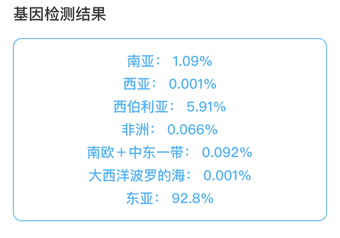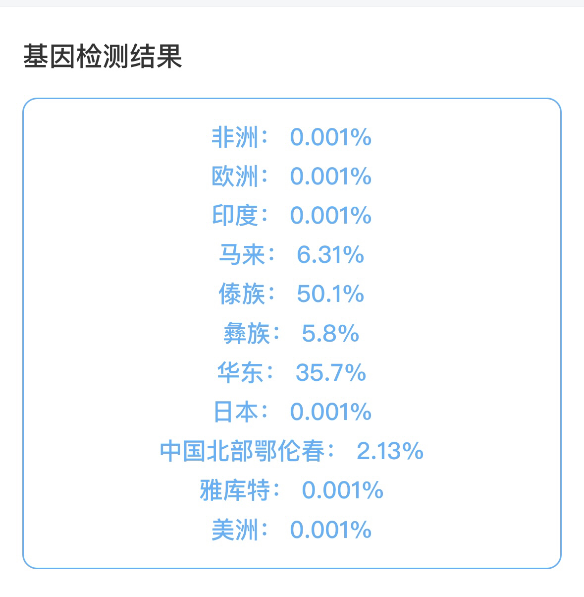 {"result":[{"race_desc":"\u4e2d\u534e\u6c11\u65cf","race_en":"chinese_nation","race_probality":"0.929018","area":[{"block":"chinese_nation","race_desc":"\u5357\u65b9\u6c49\u65cf","race_en":"han_southern","race_probality":"0.368890"},{"block":"chinese_nation","race_desc":"\u5317\u65b9\u6c49\u65cf","race_en":"han_northern","race_probality":"0.296579"},{"block":"chinese_nation","race_desc":"\u8499\u53e4\u8bed\u65cf\u7fa4","race_en":"mongolian","race_probality":"0.116229"},{"block":"chinese_nation","race_desc":"\u7eb3\u897f\/\u5f5d\u65cf","race_en":"ny","race_probality":"0.087431"},{"block":"chinese_nation","race_desc":"\u7572\u65cf","race_en":"she","race_probality":"0.046574"},{"block":"chinese_nation","race_desc":"\u62c9\u795c\u65cf","race_en":"lahu","race_probality":"0.008877"},{"block":"chinese_nation","race_desc":"\u5176\u4ed6","race_en":"other","race_probality":"0.0048"}]},{"race_desc":"\u4e1c\u5357\u4e9a","race_en":"se_asian","race_probality":"0.058263","area":[{"block":"se_asian","race_desc":"\u8d8a\u5357\u4eac\u65cf","race_en":"kinh","race_probality":"0.055293"},{"block":"se_asian","race_desc":"\u5176\u4ed6","race_en":"other","race_probality":"0.0030"}]},{"race_desc":"\u4e1c\u5317\u4e9a","race_en":"ne_asian","race_probality":"0.012480","area":[{"block":"ne_asian","race_desc":"\u97e9\u56fd","race_en":"korean","race_probality":"0.007423"},{"block":"ne_asian","race_desc":"\u5176\u4ed6","race_en":"other","race_probality":"0.0050"}]},{"race_desc":"\u5176\u4ed6","race_en":"other","race_probality":"0.0004","area":[]}],"case_id":"ANCESTRY","prefix":null,"description":"\u7956\u6e90\u5206\u6790","color":null,"detail_url":"\/report2\/ancestry\/"}